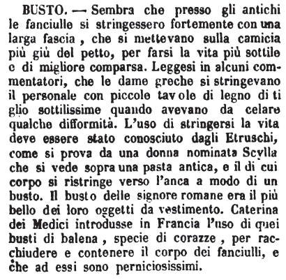 Busto - Sembra che presso gli antichi le fanciulle si stringessero fortemente con una larga fascia, che si mettevano sulla camicia più giù del petto, per farsi la vita più sottile e di migliore comparsa. Leggesi in alcuni commentatori, che le dame greche si stringevano il personale con piccole tavole di legno di tiglio sottilissimo quando avevano da celare qualche difformità. L'uso di stringersi la vita deve essere stato conosciuto dagli Etruschi, come si prova da una donna nominata Scylla che si vede sopra una pasta antica, e il di cui corpo si ristringe verso l'anca a modo di un busto. Il busto delle signore romane era il più bello dei loro oggetti da vestimento. Caterina dei Medici introdusse in Francia l'uso di quei busti di balena, specie di corazze, per racchiudere e contenere il corpo dei fanciulli, e che ad essi sono perniciosissimi. [immagine] |